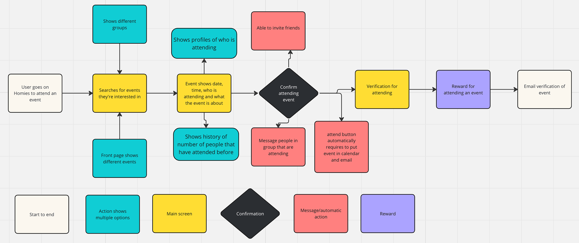 Homies is an MVP social product designed to increase real-world event attendance by addressing the gap between intent (“I’ll go”) and action (actually showing up). As a solo UX/UI designer, I researched behavioral barriers such as social anxiety, uncertainty, and lack of social reassurance, then designed and tested features that reduce friction and increase confidence before attending events.